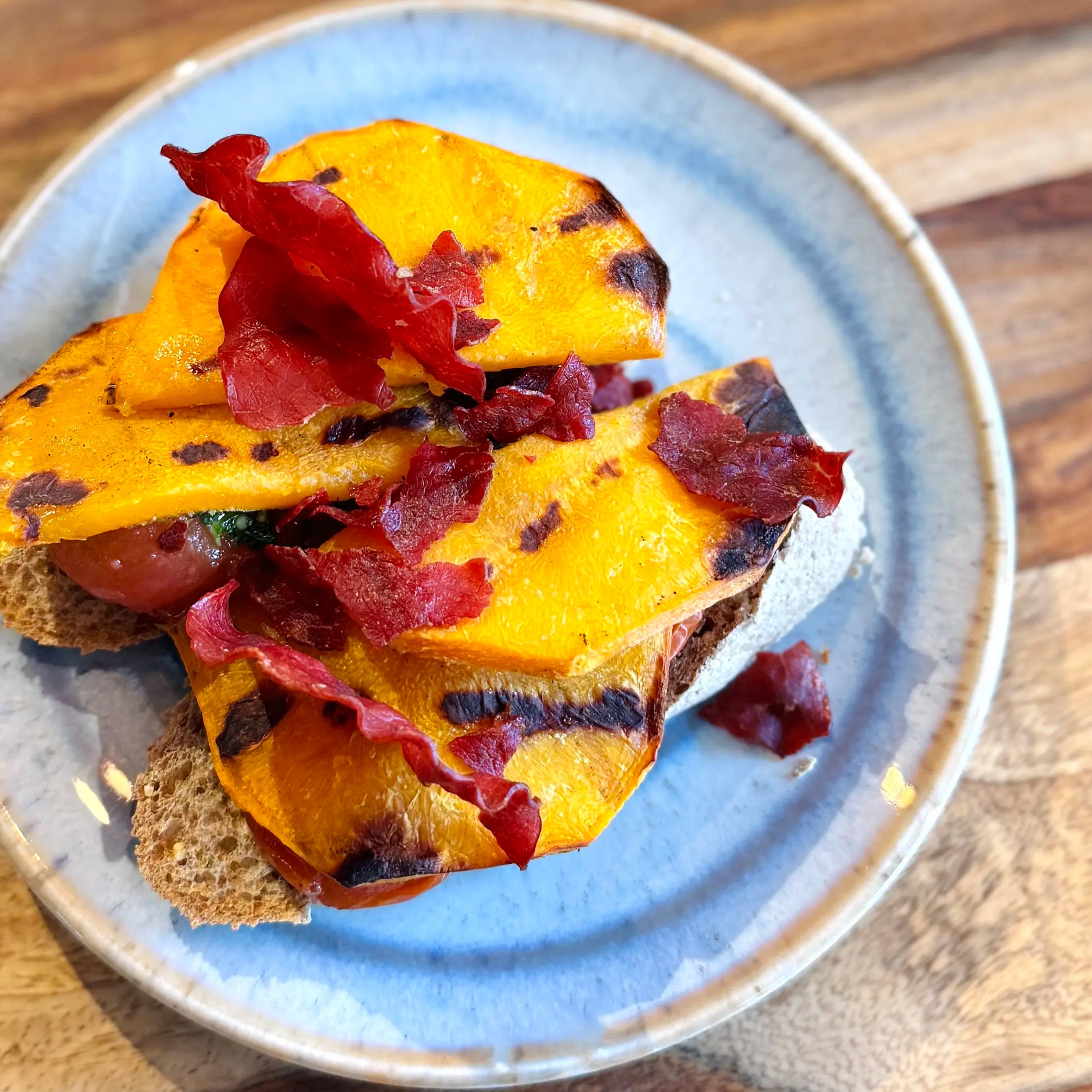 Bruschetta met gerookte tomatensaus  |  gegrilde pompoen  |  krokant runder rookvlees