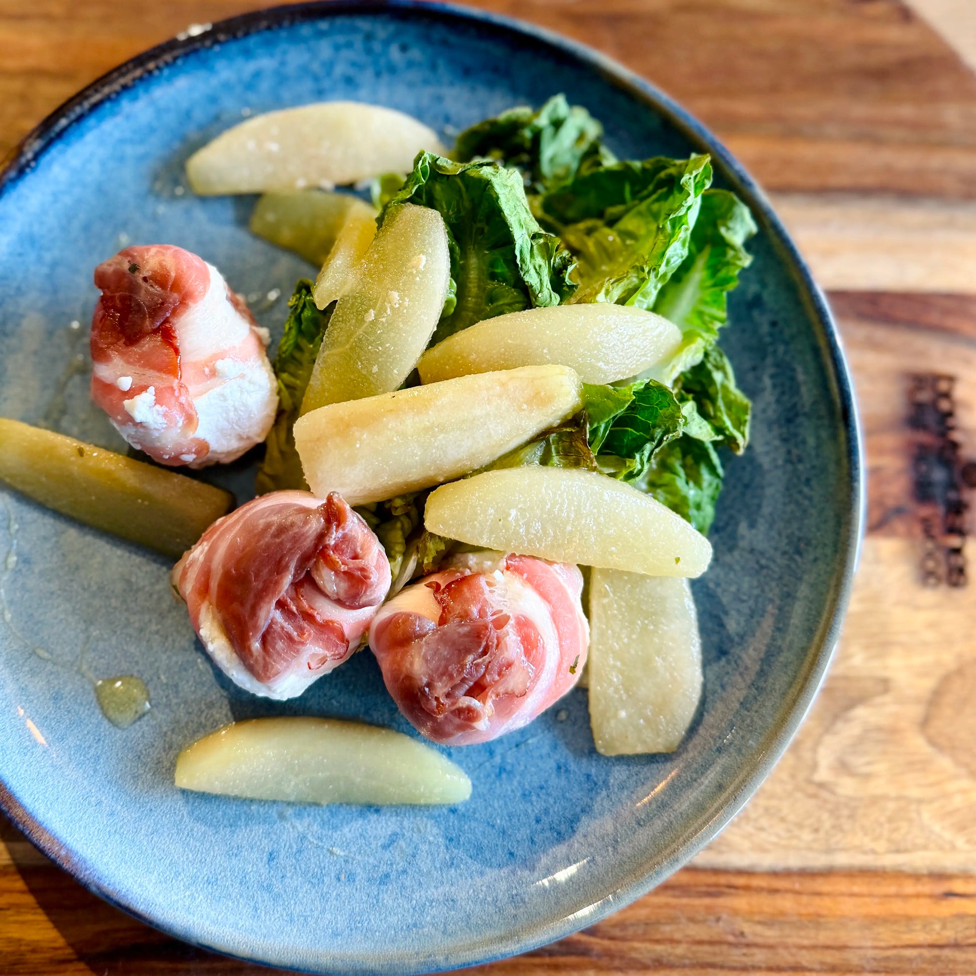Mediterraanse salade  |  peer  |  hot honey  |  geitenkaas in spek