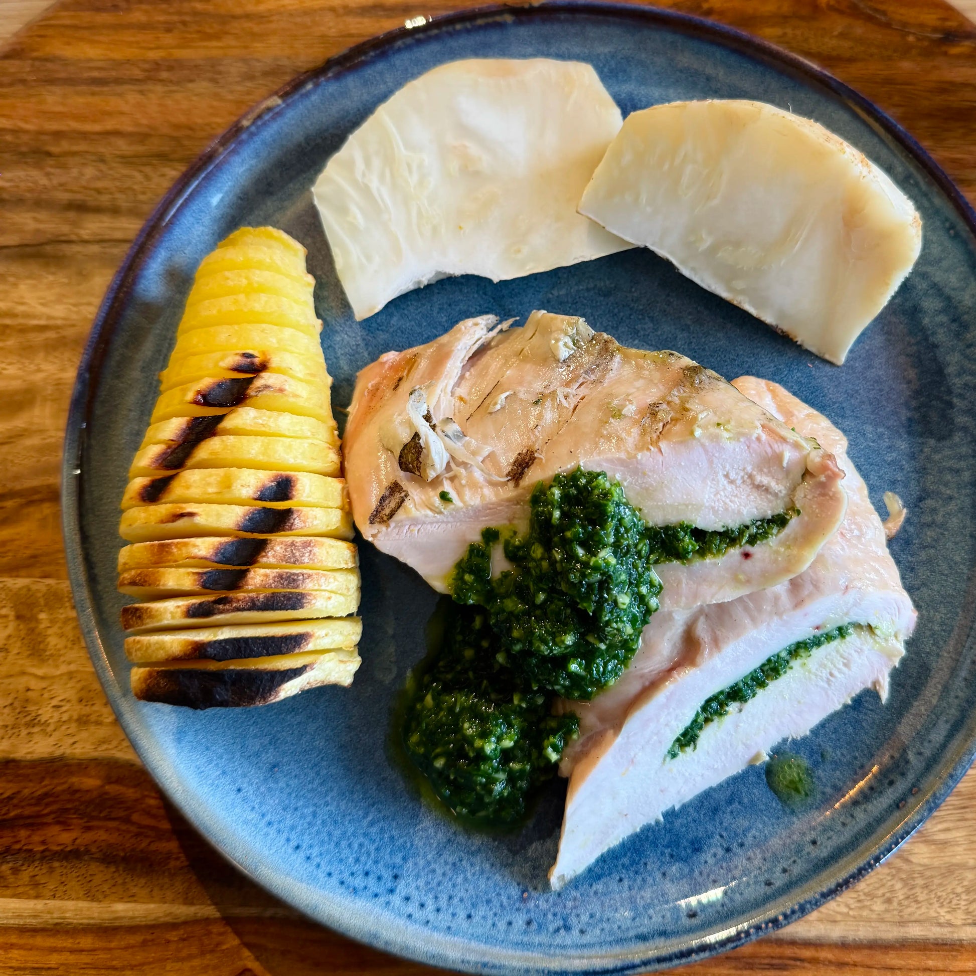 Knolselderij aan het spit  |  kipfilet gevuld met pesto  |  Hasselback pastinaak  |  martini boter