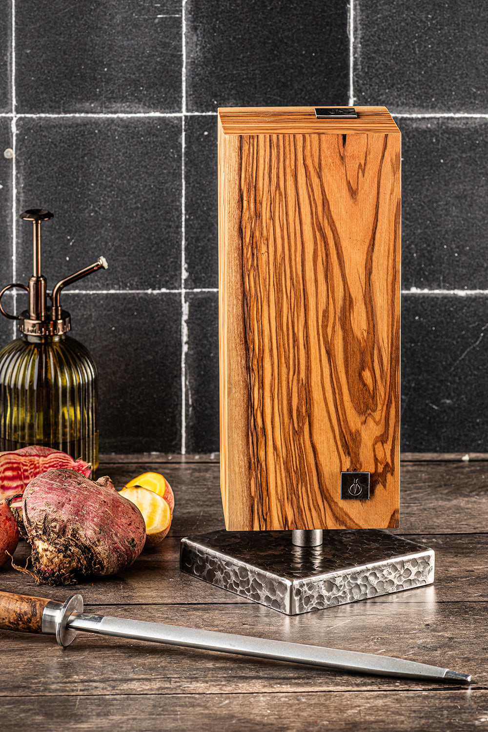Dit innovatieve roterende magnetische messenblok biedt een slimme en praktische oplossing voor het opbergen van messen. Daarnaast biedt het door het strakke design ook een visueel statement voor in elke keuken. Het patroon van het olijfhout zorgt bij elk messenblok voor een unieke en natuurlijk uitstraling die perfect past in zowel moderne als landelijke keukens.