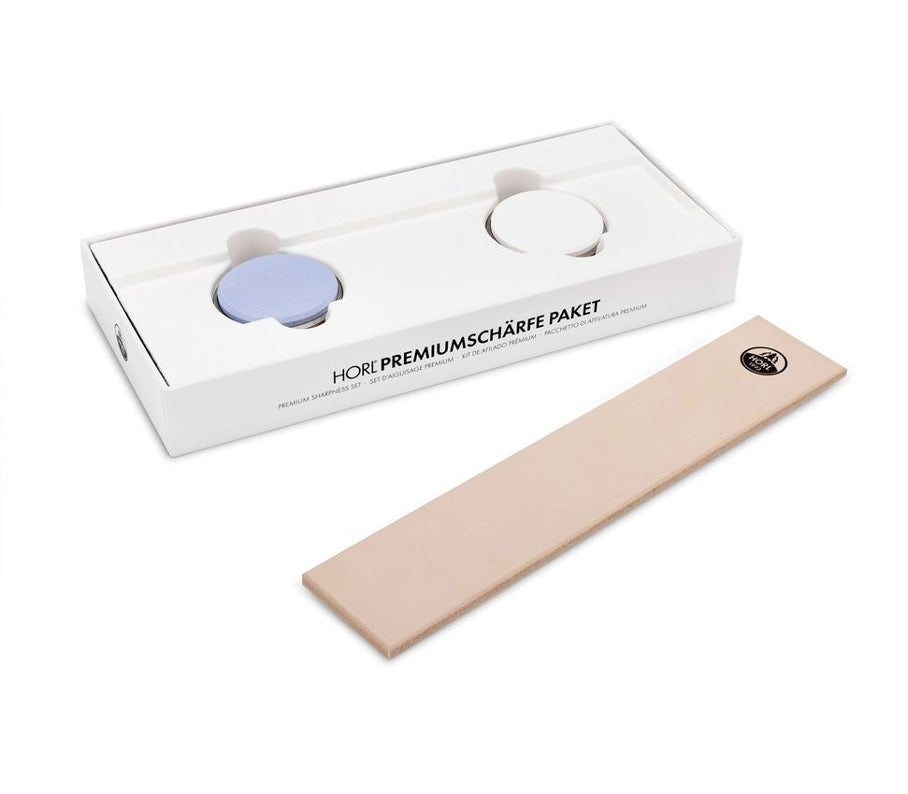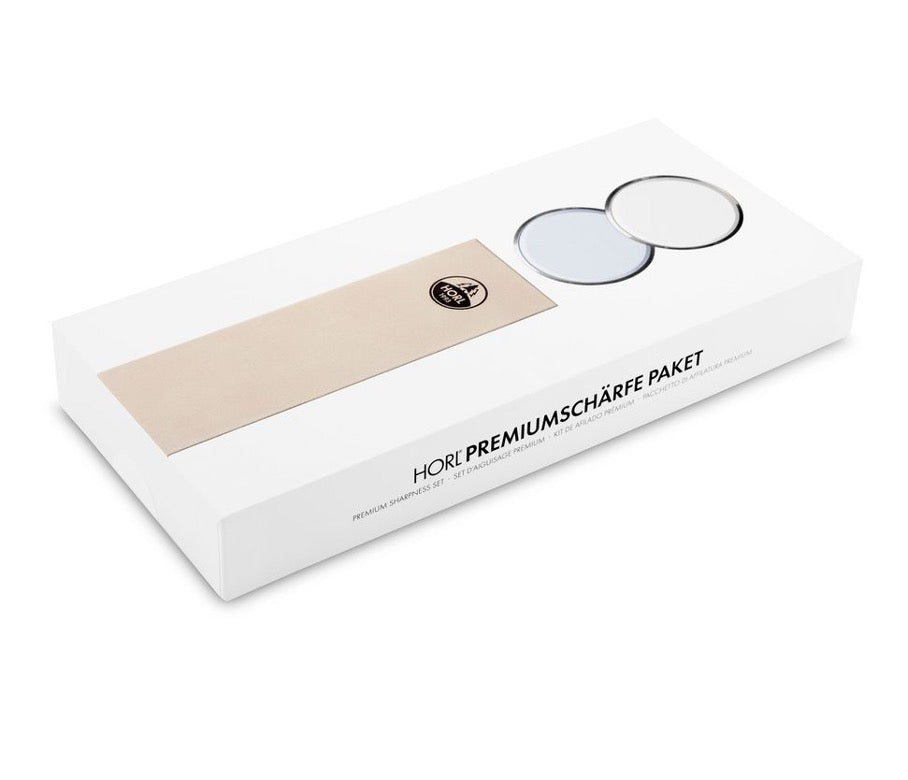 De HORL® Premium Sharpness Set haalt het volledige scherpte potentieel van bijzonder goede messen naar boven. De fijne #3000 corundum slijpsteen optimaliseert en verfijnt het resultaat van de standaard diamanten slijpschijf. Hierna zorgt de extra fijne #6000 corundum slijpsteen voor nog meer scherpte en een nog gladdere snijkant. Beide corundum slijpstenen zijn zonder water te gebruiken. Een laatste aanzet met het HORL® leer (finishing leather) levert het ultieme snijvlak op.