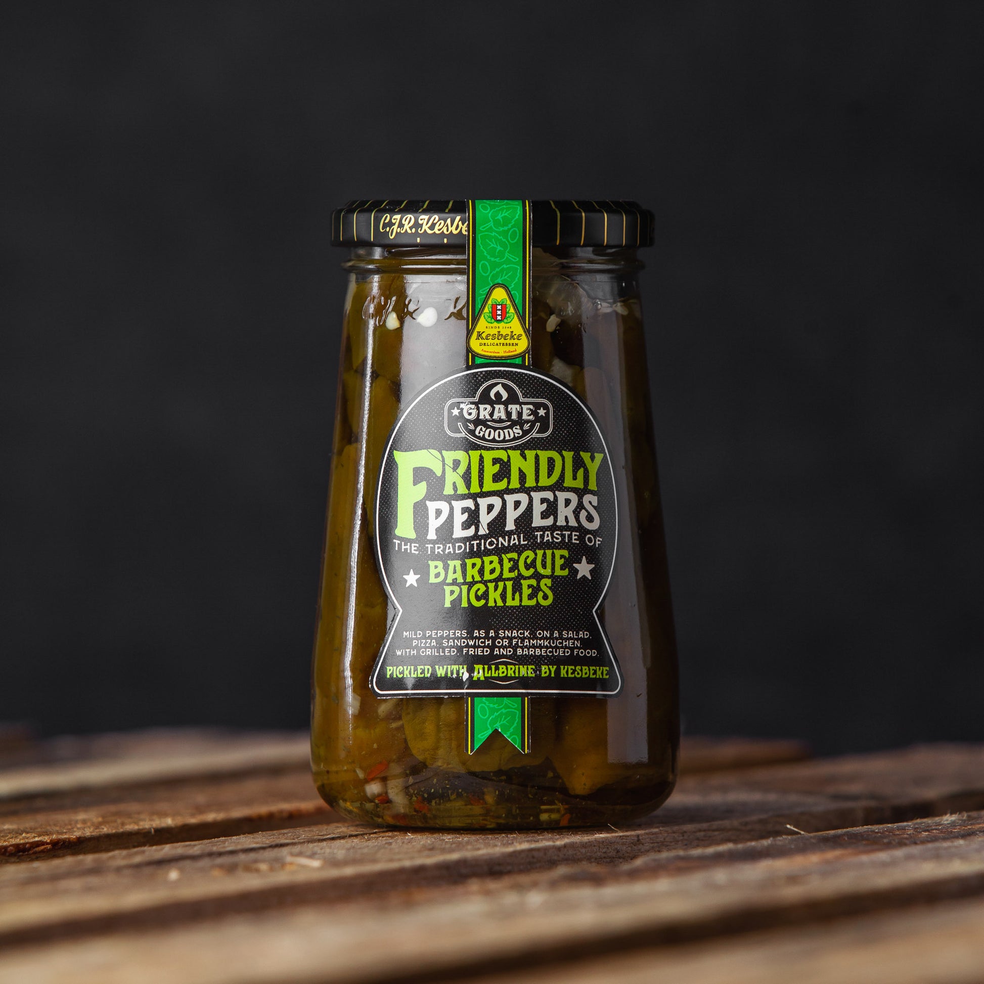 Friendly peppers is een perfect tafelzuur voor de krachtige barbecue en smaakt bijna overal goed bij. Extra lekker zijn de pepers op een broodje steak sandwich en bij een verse Flammkuchen.