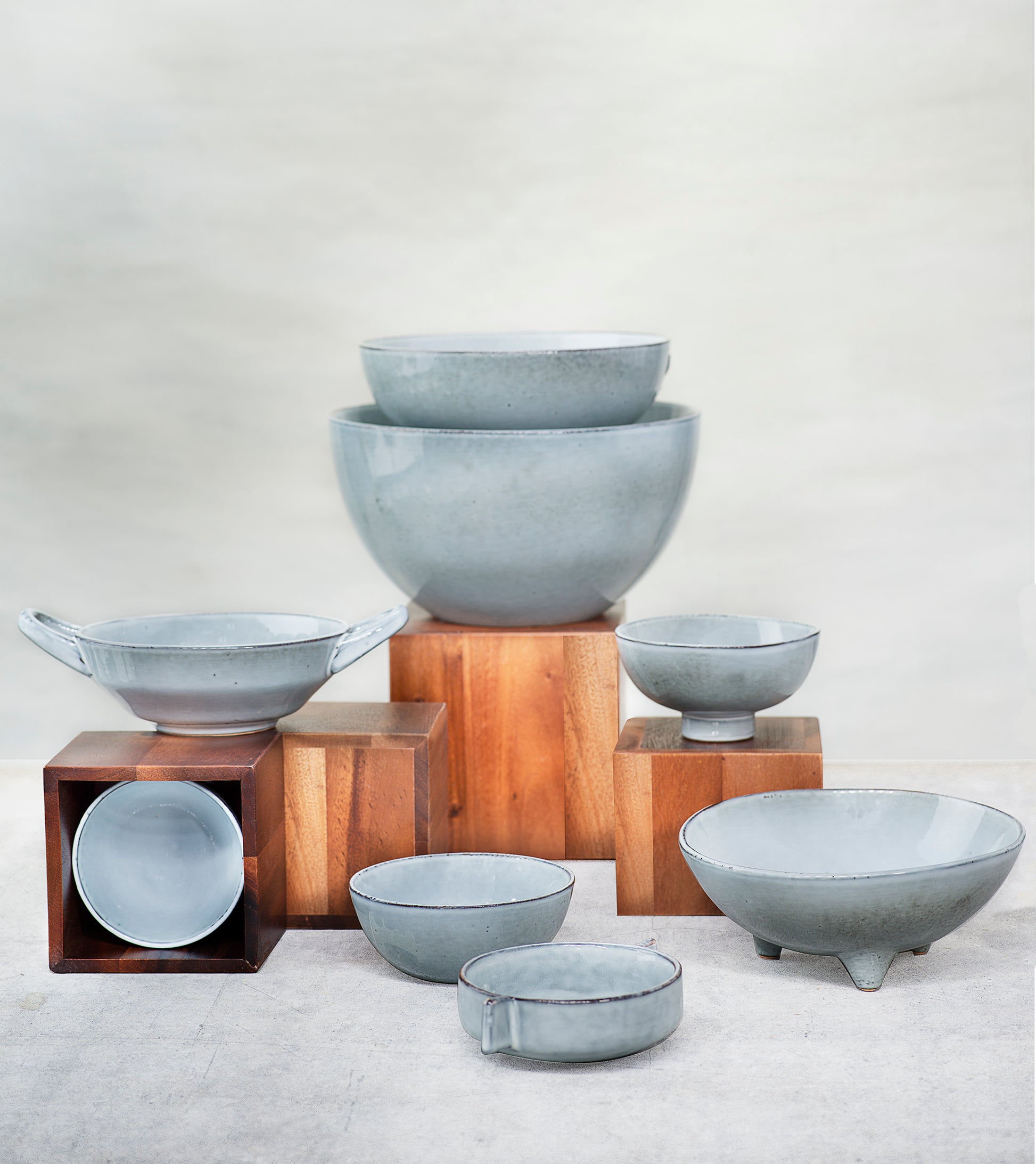 Loft is een uitgebreide aardewerkcollectie met eenvoudige vormen in talloze tinten blauwachtig grijs onder een glanzende glazuurlaag. De steenlook wordt benadrukt door zwarte spikkels en onregelmatige donkere randen.