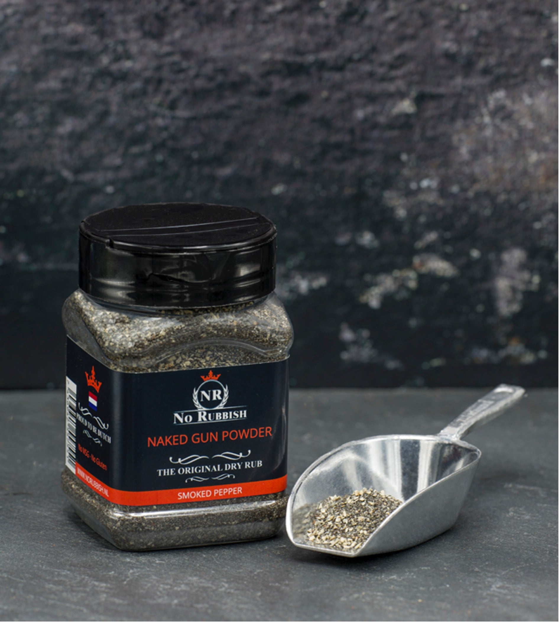 De rokerige aardse smaken van deze bijzondere rub zullen je verrassen…. denk niet wit, denk niet zwart, maar in de kleur van je hart. Stoer, mannelijk en een tikkeltje vreemd, maar absoluut een aanrader. Gun Powder, naked! De kern smaak is smoked pepper.