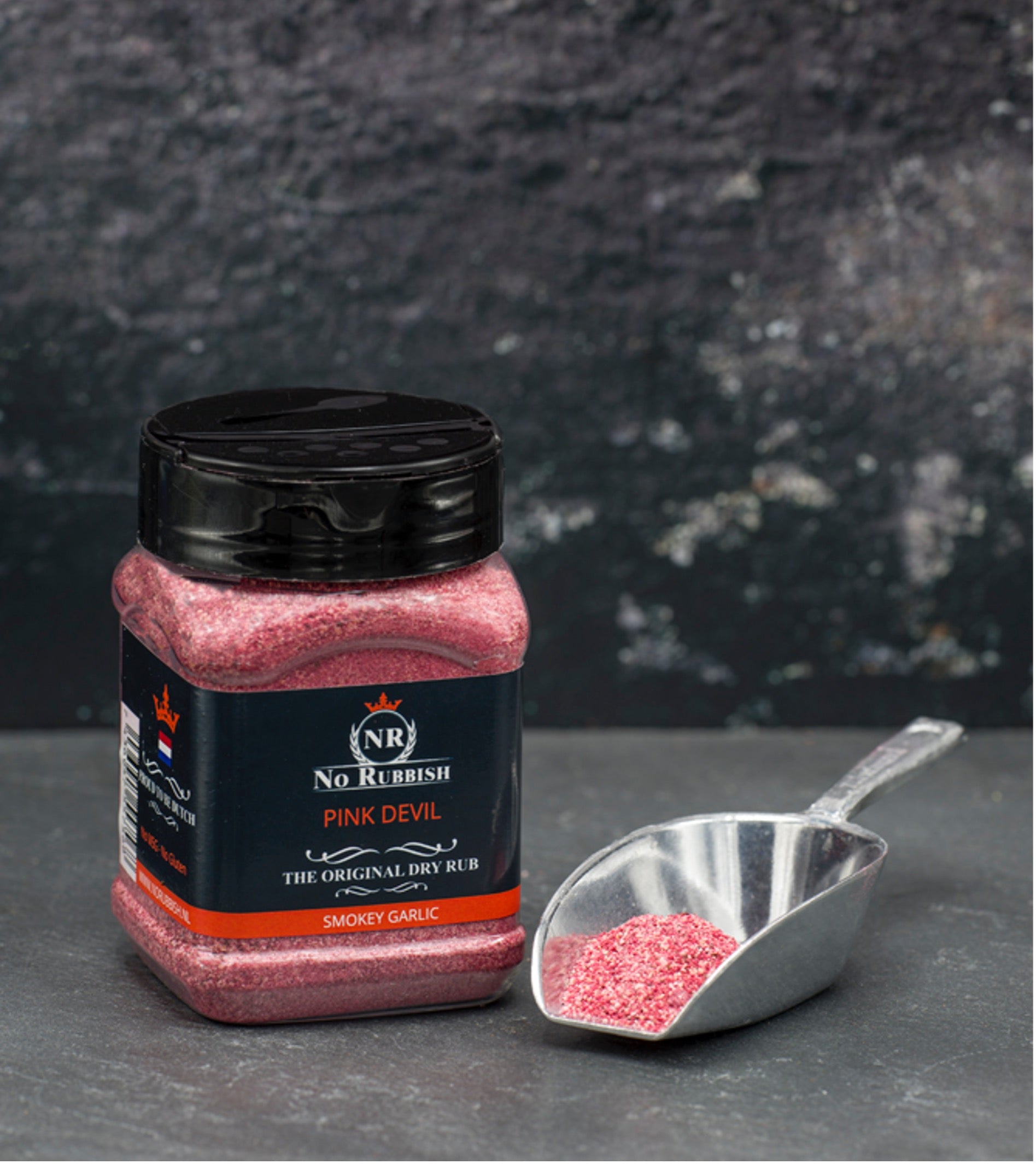 Een prachtige, kleurrijke rub met een vrouwelijke knipoog. Echter laat deze Pink Devil zich niet gemakkelijk temmen. Ze is zeer geschikt voor lange sessie’s dus daag haar uit. No way back! De kern smaak is smokey garlic.
