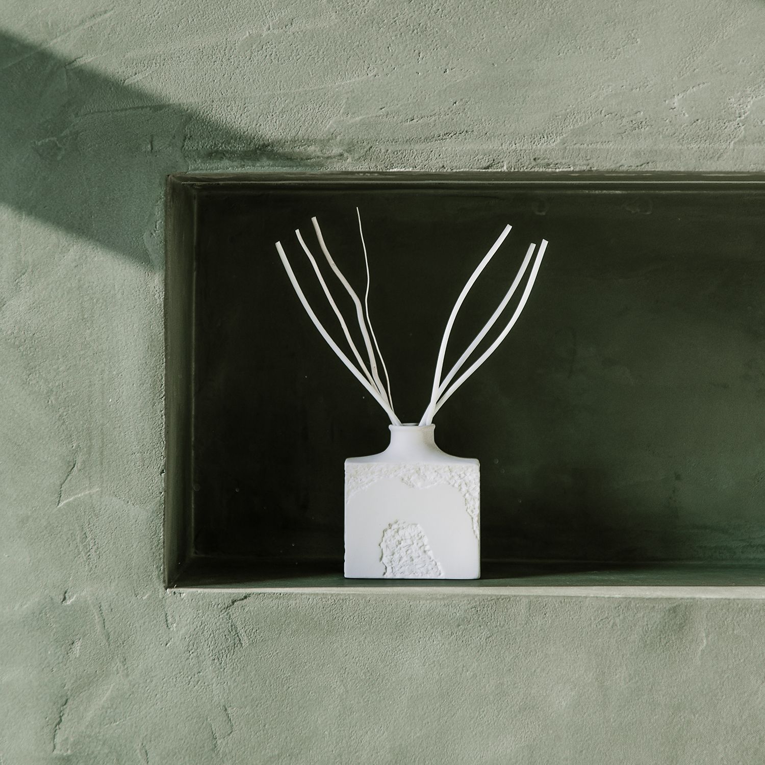 Het witte flesje heeft een subtiele, rotsachtige textuur die de puurheid van natuursteen oproept. De stokjes lijken op echte twijgjes en voegen een pure, ambachtelijke toets toe.