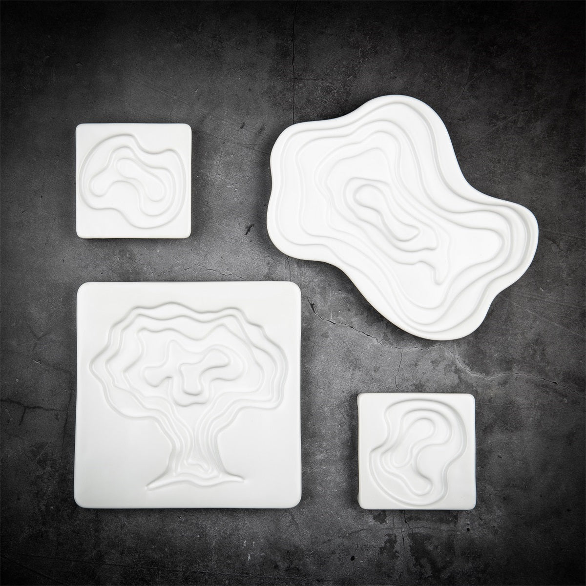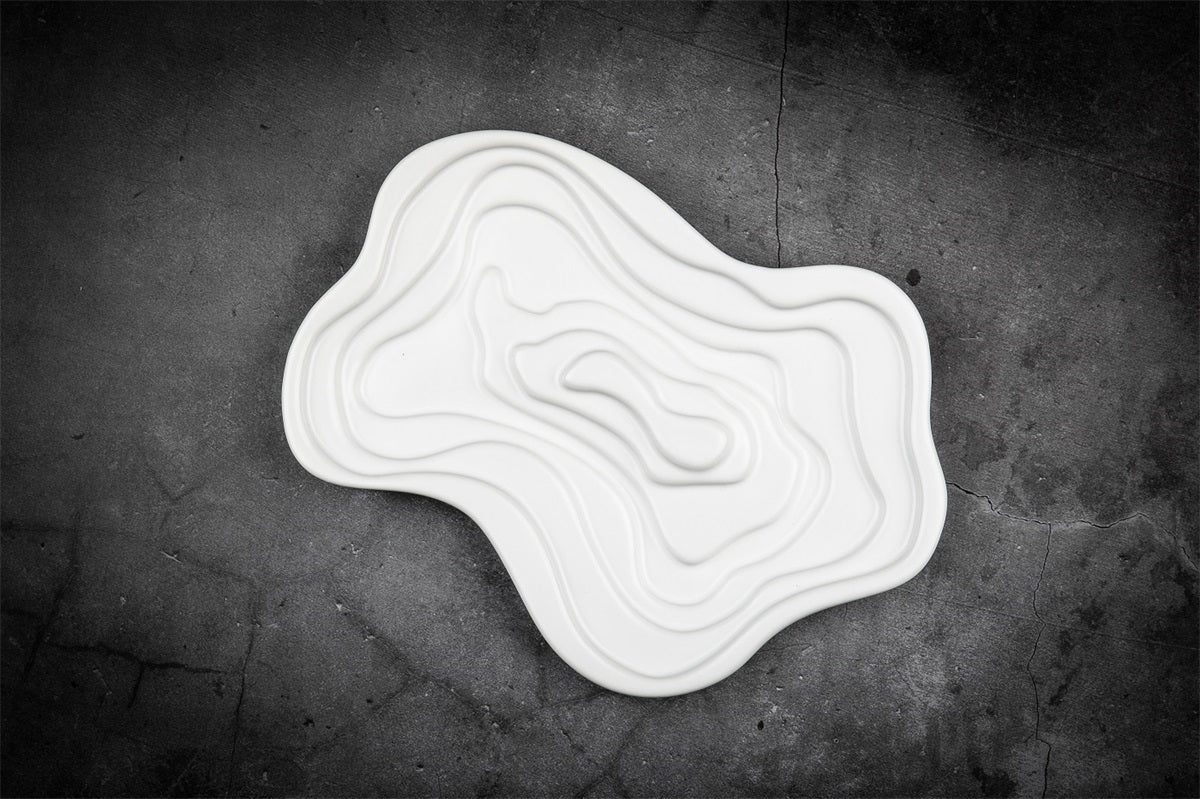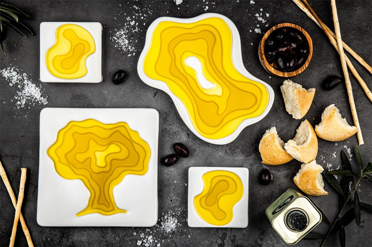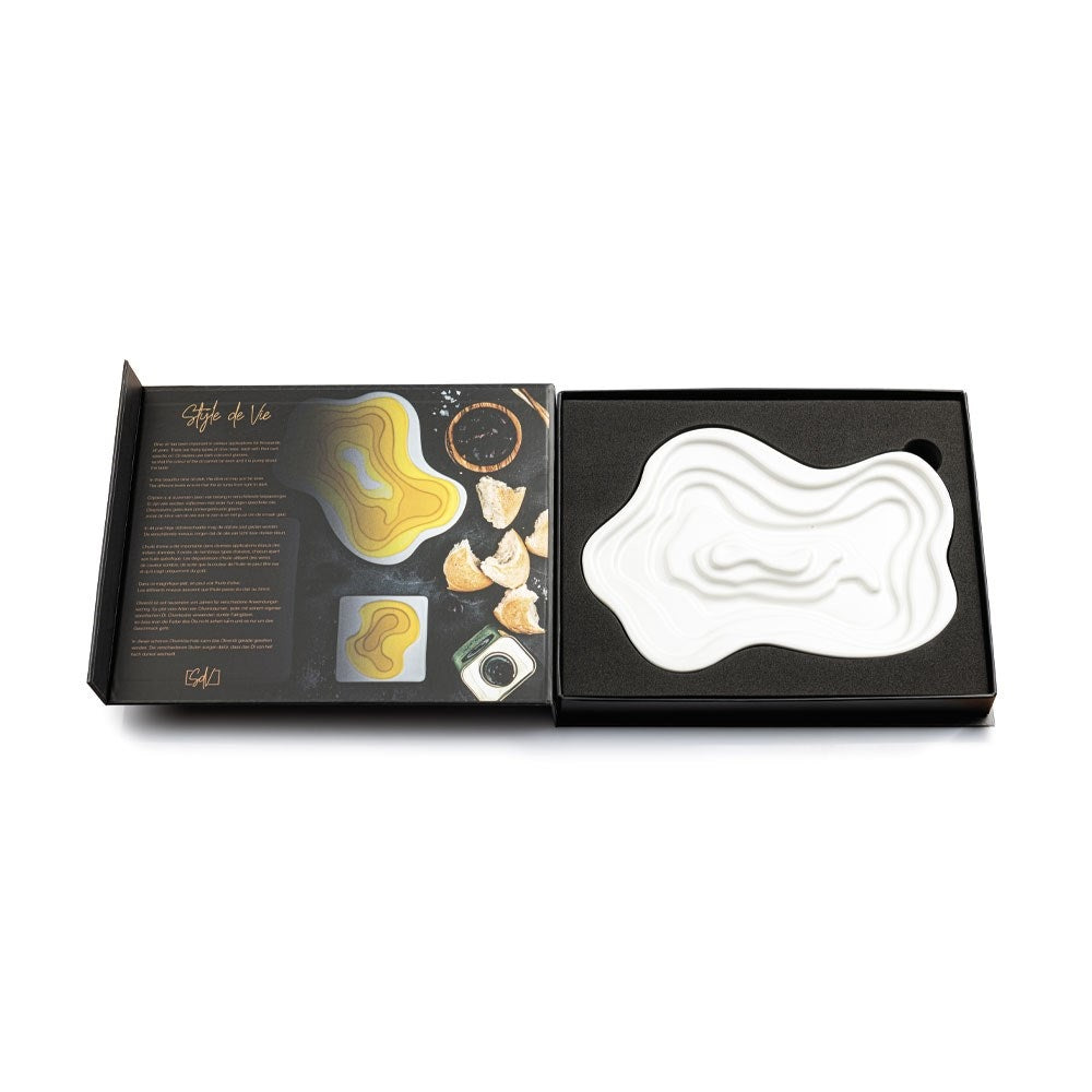 Elegante schaal met abstract patroon om (stok)brood te dippen. De olijfolie kleurt van licht naar donker door de trapsgewijze niveau's. Deze keramieke schaal is 22 cm bij 16 cm en heeft een dikte van 1,5 cm. Door de organische vorm is deze olijfschaal de mooiste keuze bij een ronde tafel of ronde borrelplank.
